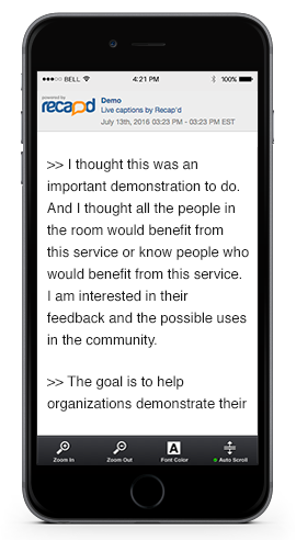 This service of Recap'd delivers captions to a webpage or mobile device for events in real-time as they are sent by the captioner. It can be used for any live web conference, meeting or call. Users only need a browser on their computer or mobile device to view the captions. Incoming captions can be delivered to a webpage dedicated to an event or used in a widget that can be embedded on any webpage. The captions are archived immediately after the event, and can be output in several different formats.