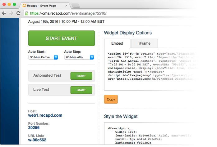 The Recap'd widget is an application that can be embedded in a web page to stream live captioning for an event. The widget code is generated from the admin interface, and can be pasted into the html of a web page. Administrators can upload a logo and fully customize the widget styles (CSS) to seamlessly integrate it with a particular website or brand.